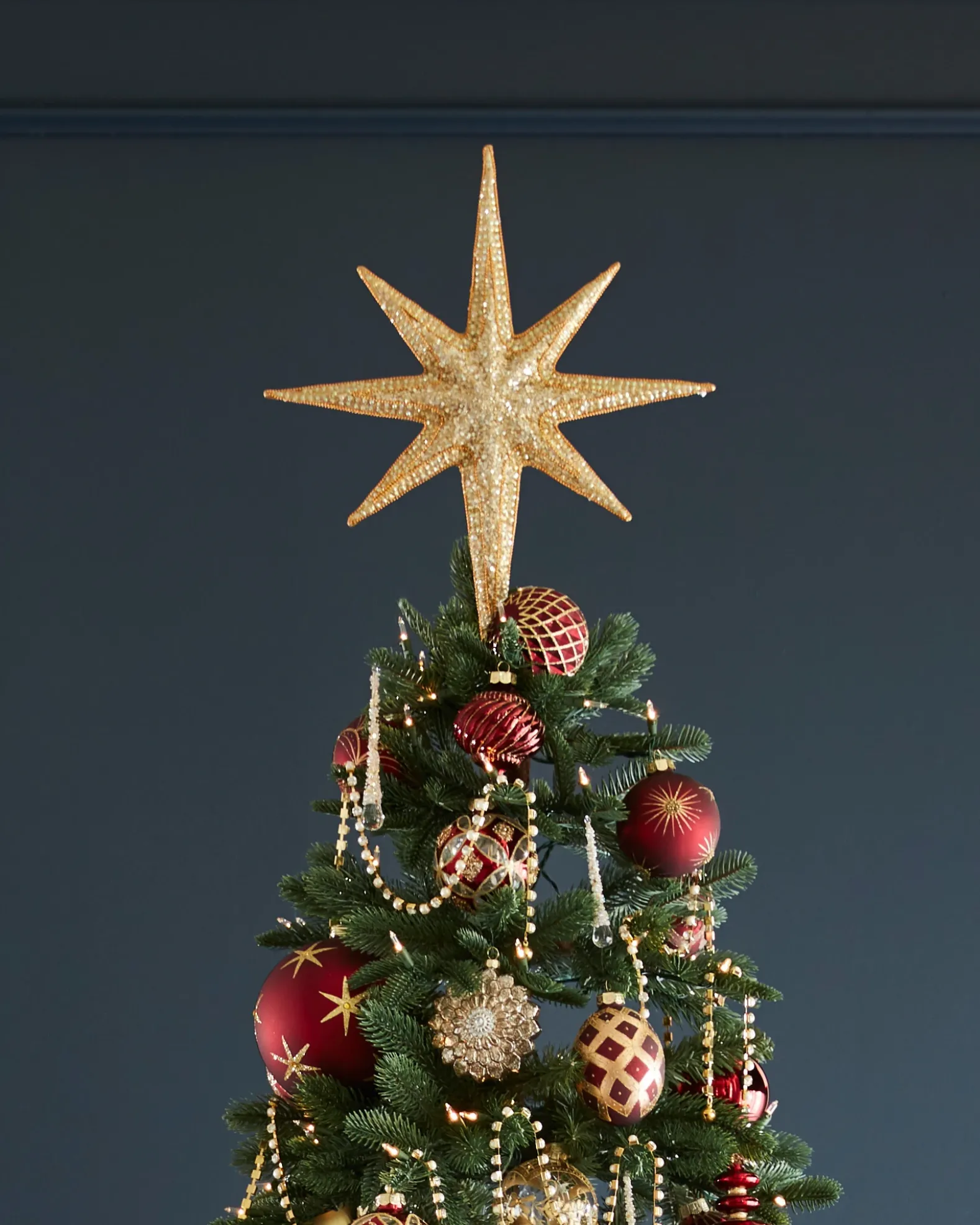 Complete the look of your tree with an iconic Christmas symbol. This Bethlehem-inspired star topper features metallic trim for a shimmering statement.